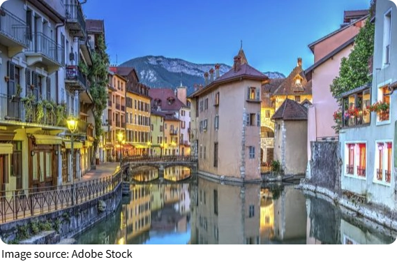 Chúng ta hãy bắt đầu hành trình tại Annecy, một thành phố đẹp như tranh vẽ ở phía đông nam nước Pháp. Nằm ở cực bắc của hồ Annecy và chỉ cách Geneva 35 km về phía nam, thành phố này thường được gọi là "Viên ngọc của dãy Alps thuộc Pháp".