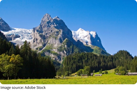 - Snowy slopes contrast with green meadows of Grindelwald