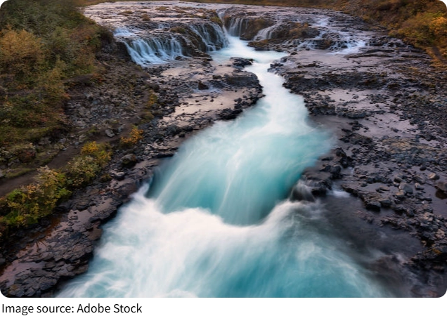 This suspended sediment scatters light in a specific way — absorbing the longer red wavelengths while reflecting the shorter blue and green wavelengths back toward the observer. Against Iceland's dark volcanic basalt, which provides one of the strongest possible tonal contrasts, the effect is amplified to the point where the color reads as almost artificially saturated. The braided channel pattern — where the river divides across a wide floodplain around deposited sediment islands — forms because glacial rivers carry more material than a single channel can transport, spreading the flow across a broad outwash plain in the shifting, complex patterns that make aerial views of this river so compelling.